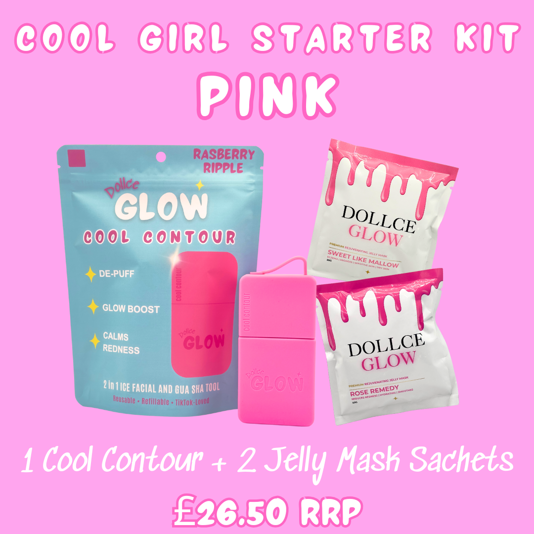 Meet the Cool Girl Starter Kit – Pink 💖 The ultimate self-care starter pack, combining our viral Cool Contour in Raspberry Ripple with two bestselling Dollce Glow Jelly Mask sachets.